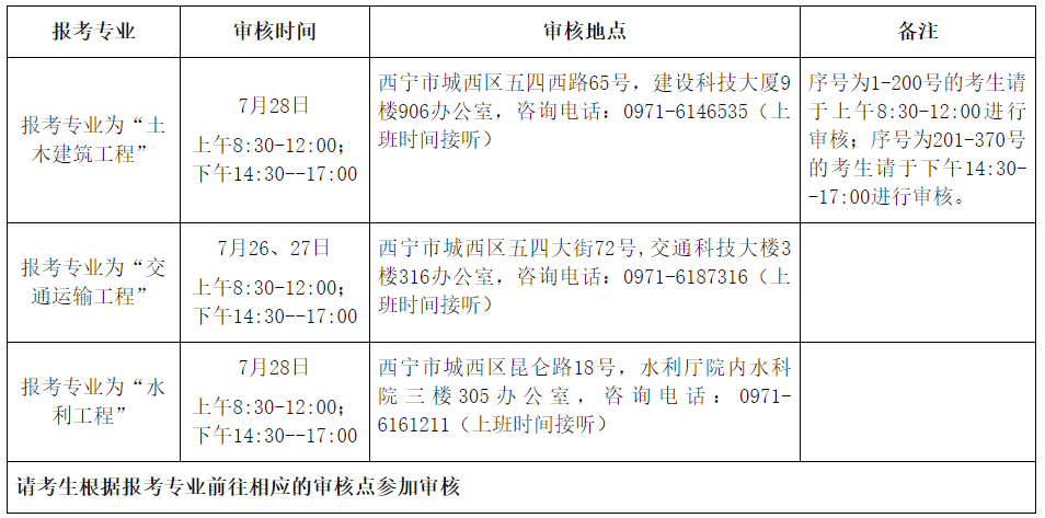 報考專業(yè)為“土木建筑工程”的考生只需攜帶原件,無需復(fù)印件。報考專業(yè)為“交通運輸工程”和“水利工程”的考生需攜帶原件及復(fù)印件,學(xué)信網(wǎng)查不到學(xué)歷認(rèn)證報告的請攜帶學(xué)籍檔案材料。若本人不在西寧,可委托他人攜帶原件進(jìn)行審核。