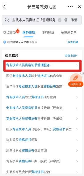 第三步:搜索服務(wù)事項(xiàng)“專業(yè)技術(shù)人員資格證書(shū)管理服務(wù)”。