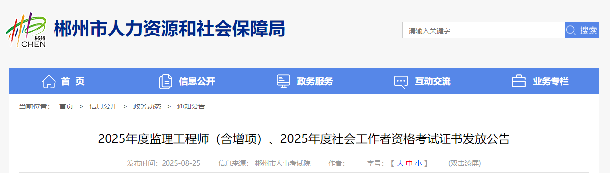 2025年度監(jiān)理工程師(含增項(xiàng))、2025年度社會(huì)工作者資格考試證書發(fā)放公告