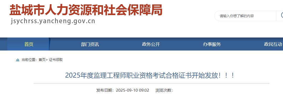 江蘇省鹽城市2025年監(jiān)理工程師資格證書發(fā)放通知