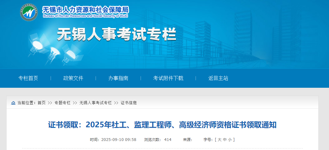 江蘇無錫考點2025年監(jiān)理工程師合格證書領取通知