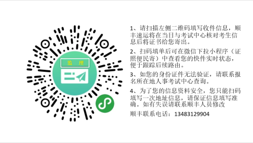 1. 填報(bào)信息的“姓名”即為“收件人姓名”,請(qǐng)務(wù)必與資格證本人的姓名一致。身份證必須與報(bào)名考試時(shí)的信息一致,請(qǐng)?zhí)顚?xiě)正確的聯(lián)系方式,否則不予受理。