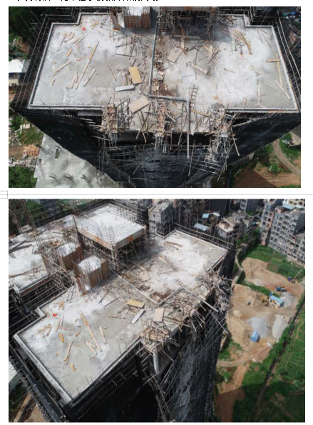 一是涉事建筑第20層樓頂天面裝飾花架梁板模板支撐體系采用木立柱支撐,沒有設(shè)置縱橫向水平拉結(jié)構(gòu)造穩(wěn)定措施,木立柱存在偏心受力工況,穩(wěn)定性差;