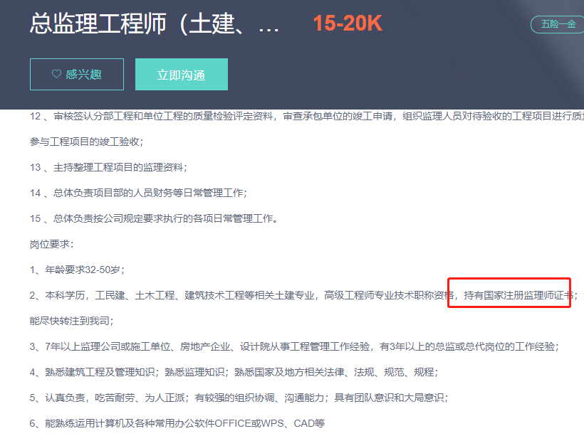 這是小編在某招聘軟件上截取的招聘要求及薪資,可以看出持有監(jiān)理工程師證書的總監(jiān),薪資并不是很低,付出一定會有所收獲,所以大家一定不要被外面的言語所困,符合監(jiān)理工程師報名條件,能報考監(jiān)理工程師考試的一定要報名,不給自己一次機會,永遠都不知道自己可以達到什么樣的高度,不固步自封,該學習學習,該努力努力,甭管大家怎么說,同樣的機會放在面前,相信考下證書的你一定會比沒考下的人機會更多~
