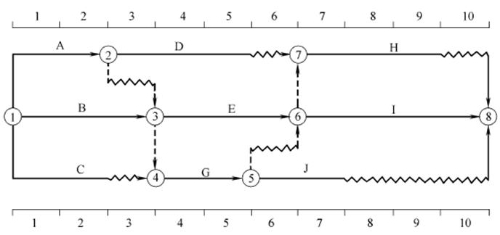 【答案解析】 本題考查的是時標(biāo)網(wǎng)絡(luò)計劃中時間參數(shù)的判定。工作的總時差:(1)以終點節(jié)點為完成節(jié)點的工作,其總時差應(yīng)等于計劃工期與本工作最早完成時間之差;(2)其他工作的總時差等于其緊后工作的總時差加本工作與該緊后工作之間的時間間隔所得之和的最小值。據(jù)此計算,工作I的總時差為0,工作H的總時差為1,工作J的總時差為3,工作G的總時差為min{0+1,1+1,3+1}=1,則工作C的總時差為min{1+1}=2。