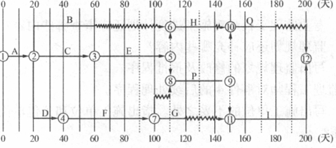 某工程,建設(shè)單位通過(guò)招標(biāo)與甲施工單位簽訂了土建工程施工合同,包括A~I(xiàn)共9項(xiàng)工作,合同工期200天;與乙施工單位簽訂了設(shè)備安裝施工合同,包括P、Q共2項(xiàng)工作,合同工期70天。