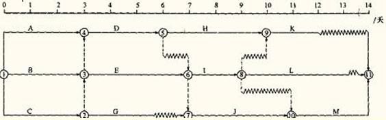 某分部工程雙代號時標(biāo)網(wǎng)絡(luò)計(jì)劃如下圖所示,其中工作I的總時差和自由時差( )天。