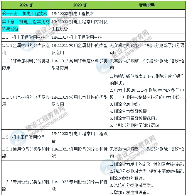 2024年一建《機電工程》教材變動對比及總結