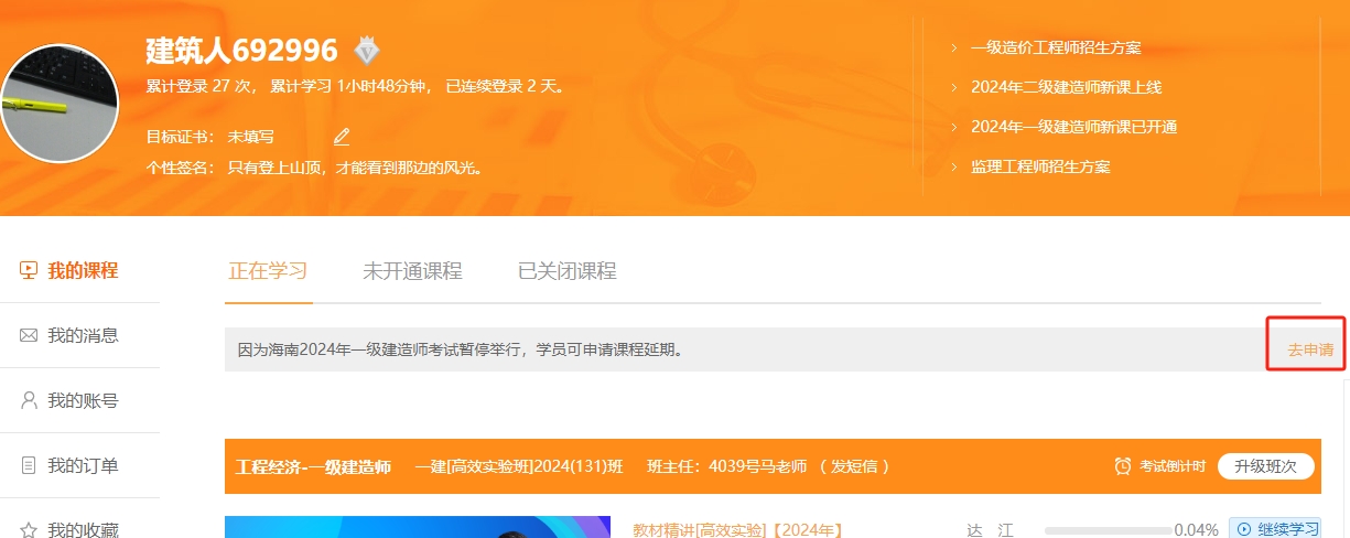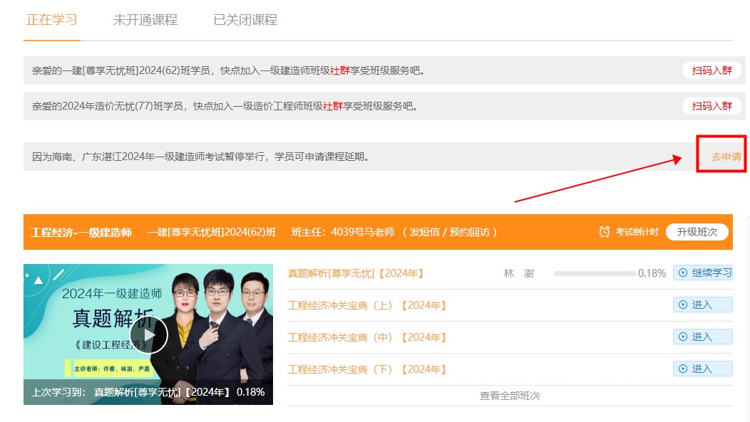 已經(jīng)報(bào)名網(wǎng)校2024年一級(jí)建造師考試超值精品班、高效實(shí)驗(yàn)班、VIP特訓(xùn)營(yíng)、面授特招班、臨考特訓(xùn)班課程的??伎忌F(xiàn)在可以申請(qǐng)延期課程了,入口在“我的網(wǎng)校我的家”,請(qǐng)大家及時(shí)申請(qǐng),不要錯(cuò)過(guò)。