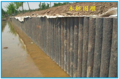 3.木樁竹條土圍堰:利用木樁(松木使用較多)及打入水中形成排式擋水結(jié)構(gòu),一側(cè)填土來(lái)進(jìn)行過(guò)止水。