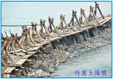 4.竹籬土圍堰:采用木樁打入水中形成框架,利用竹籬填土石來(lái)而形成的擋水結(jié)構(gòu)。