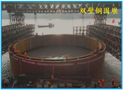 10.雙壁鋼圍堰:雙壁鋼圍堰為圓形圍堰,其堰壁鋼殼是由有加勁肋的內(nèi)外壁板和若干層水平桁架所組成,水平桁架的間距根據(jù)圍堰灌水下沉和圍堰內(nèi)抽水各階段的水頭壓力計(jì)算,為1.0~1.4m不等。堰壁底端設(shè)刃腳,以利于下沉入土。在堰壁內(nèi)腔,用隔艙板等分為若干個(gè)密封的隔艙,借助向密閉隔艙注水或抽水來(lái)控制雙壁鋼圍堰在下沉?xí)r的傾斜。