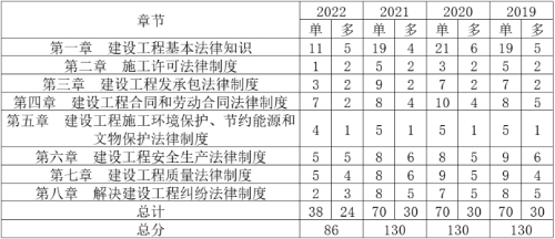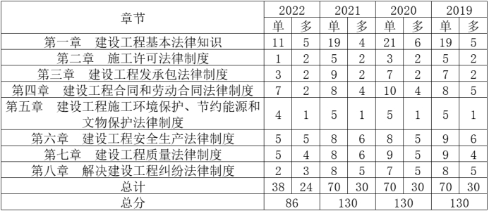 今年考試比較常規(guī),和往年相比,難度不大,大部分都是教材原文知識點,也沒有那些彎彎繞繞。就今年的考試試題的不完全統(tǒng)計,各章節(jié)分值分布與往年預(yù)估沒有太大變化,考點分布較均勻,大多數(shù)考生反映《法規(guī)》考題相對簡單,下面就讓我們看一下近四年考題分值的分布情況:
