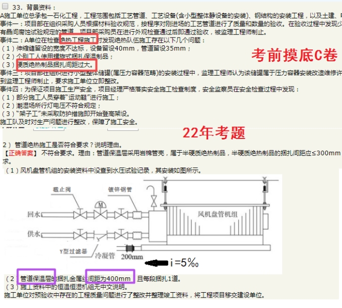 此次考試總體講:客觀題中規(guī)中矩,都是老師反復(fù)強(qiáng)調(diào)的知識(shí)點(diǎn)。主觀題實(shí)操性越來(lái)越強(qiáng),圖文結(jié)合,考查考生將問(wèn)題與教材理論接軌的能力。比如配電柜柜體的間隙要求?冷凝管的坡度要求——作為數(shù)字類(lèi)的識(shí)圖挑錯(cuò)題出現(xiàn);還有簡(jiǎn)答型識(shí)圖題——自動(dòng)扶梯的組成等。關(guān)于風(fēng)機(jī)盤(pán)管的安裝技術(shù)要求,半小問(wèn)超出教材考查規(guī)范內(nèi)容,但對(duì)總體通過(guò)考試影響不大。