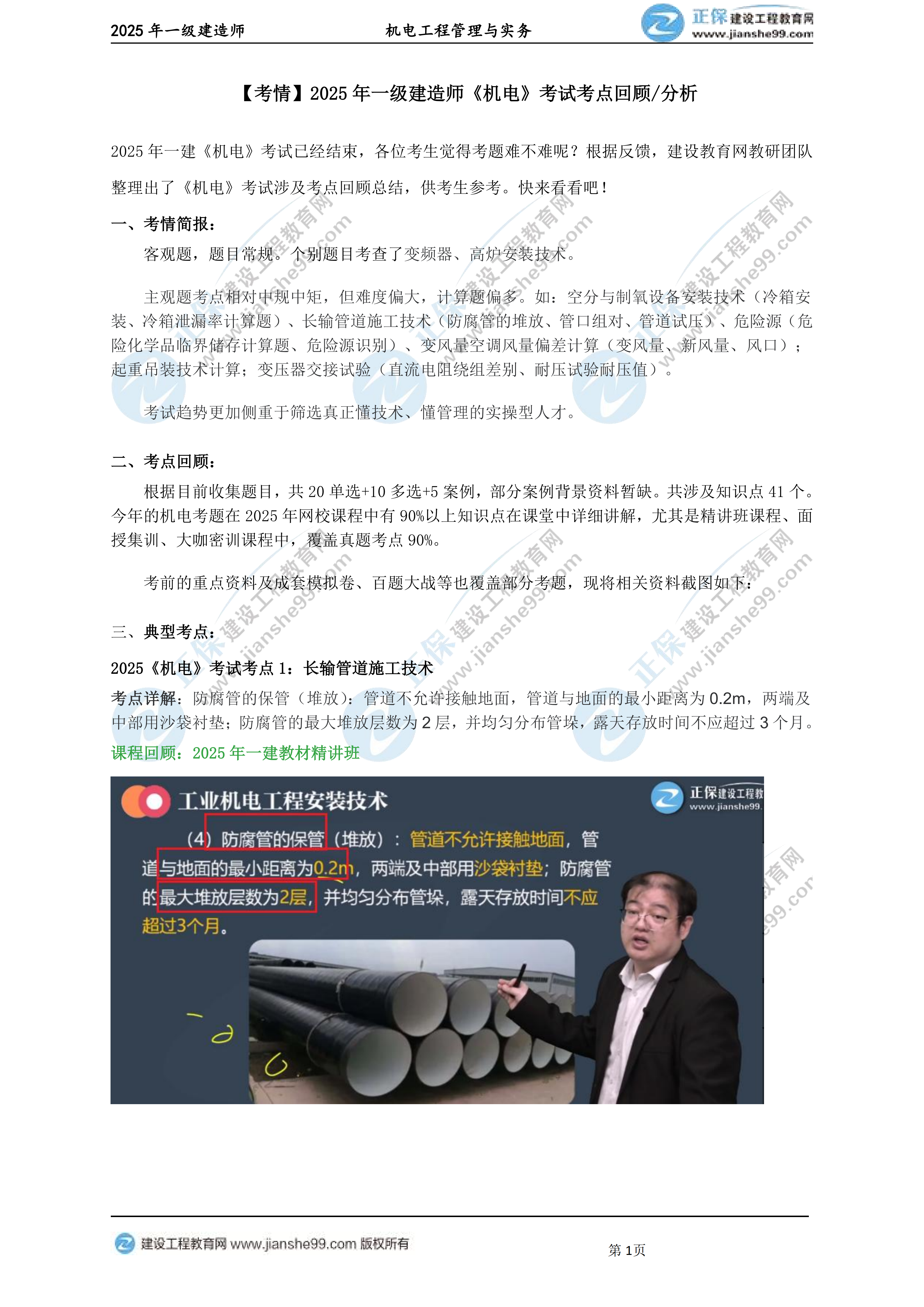 根據(jù)目前收集題目,共20單選+10多選+5案例,部分案例背景資料暫缺。共涉及知識點41個。今年的機電考題在2025年網(wǎng)校課程中有90%以上知識點在課堂中詳細講解,尤其是精講班課程、面授集訓、大咖密訓課程中,覆蓋真題考點90%。