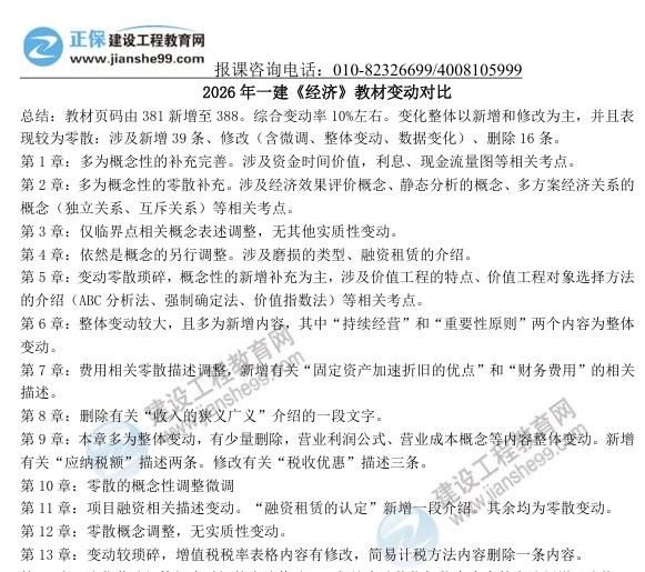 2026年一級(jí)建造師《工程經(jīng)濟(jì)》新教材變動(dòng)對比來嘍!建設(shè)工程教育網(wǎng)教務(wù)團(tuán)隊(duì)拿到教材后第一時(shí)間為大家梳理變動(dòng)詳細(xì)內(nèi)容,經(jīng)核對,2026年工程經(jīng)濟(jì)科目整體變動(dòng)約10%,教材變動(dòng)內(nèi)容如下。達(dá)江老師為大家?guī)砹私滩淖儎?dòng)解析直播,可以點(diǎn)擊下方圖片進(jìn)入直播回放入口查看