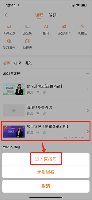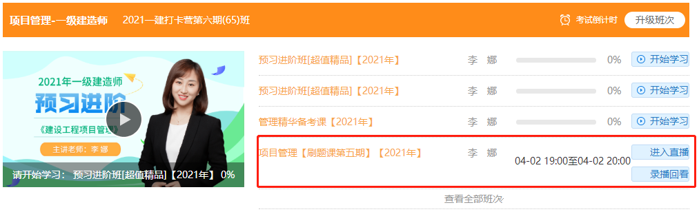 點(diǎn)擊我的課程—項(xiàng)目管理—項(xiàng)目管理[刷題課第五期]2021—點(diǎn)右側(cè)進(jìn)入直播—進(jìn)入后即可觀看直播!