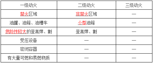 表格的內(nèi)容,記住二級(jí)動(dòng)火即可,三級(jí)動(dòng)火的情況是無法描述的,所以考試案例背景中無法敘述,那么只要案例題目出現(xiàn)動(dòng)火的內(nèi)容,只要不是二級(jí)的,就是一級(jí)的,非此即彼。