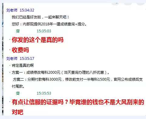 要是也有小伙伴遇到這種自稱和內(nèi)部工作人員有合作可以提前查成績并且改分的,那一定就是騙子了,一級建造師考試作為國家級的考試由人事部、建設(shè)部共同組織實施,不會存在花錢改分的問題,所有等成績實在無聊的話也可以和騙子聊一聊解悶像上面的考友一樣,但是提到交錢的話要趕緊撤或者跟相關(guān)部門舉報。