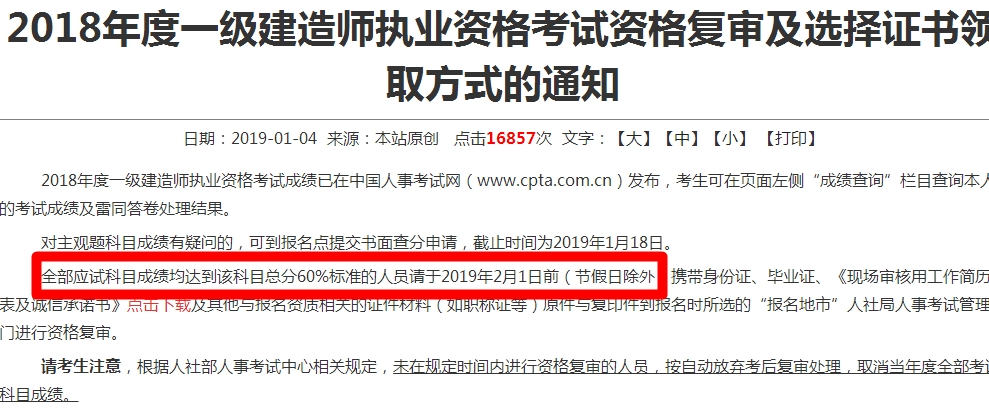 2018年一級建造師考試成績已公布,小伙伴們最關(guān)心的就是合格標準了,近幾年一級建造師的合格標準都為總成績的60%雷打不動,2018年的合格標準雖然還沒公布但基本也是如此,在1月3日西藏公布的考后復核文件,1月4日云南考后復核文件,1月9日重慶和1月11日廣東公布的考后復核文件中都寫到復核分數(shù)線為總成績的60%