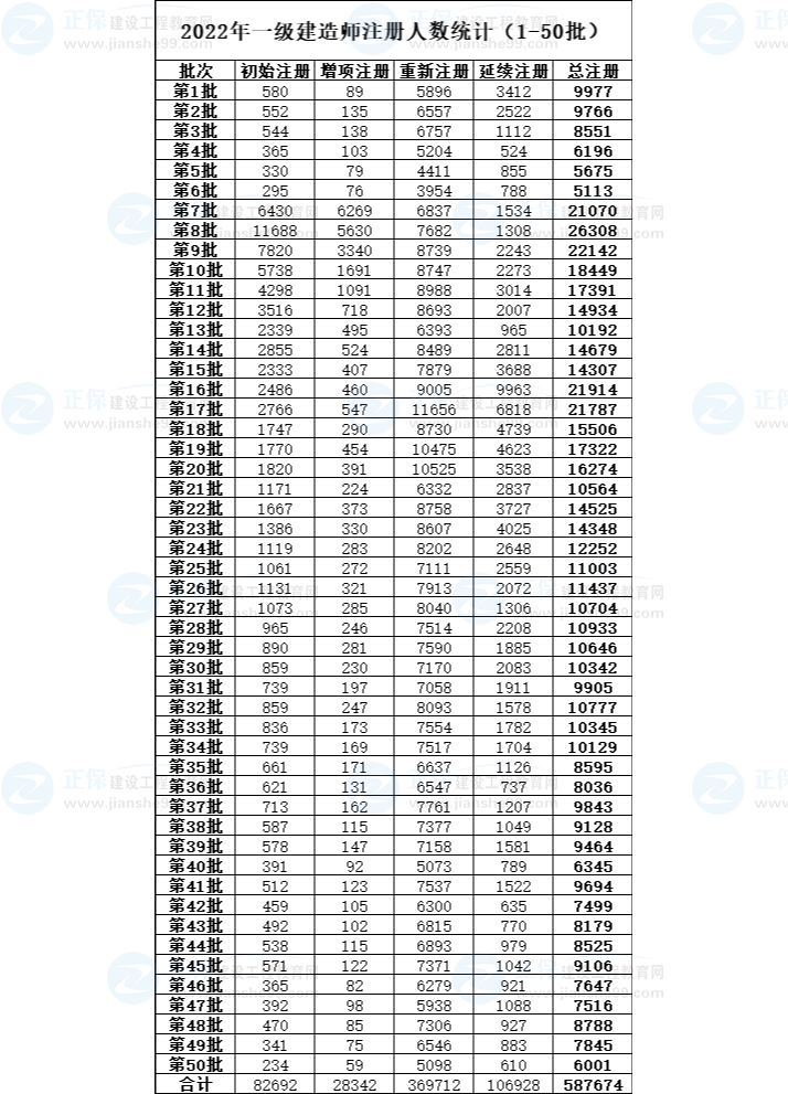 首先看一下22年的注冊情況——2022年1-50批一級建造師注冊人員名單中,累計(jì)準(zhǔn)予587674人通過一級建造師注冊。其中初始注冊82692人,增項(xiàng)注冊28342人,重新注冊369712人,延續(xù)注冊106928人。
