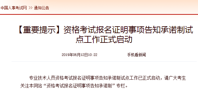 2019年6月12日,中國人事考試網(wǎng)發(fā)布了正式啟動資格考試報名證明事項告知承諾制試點工作的通知: