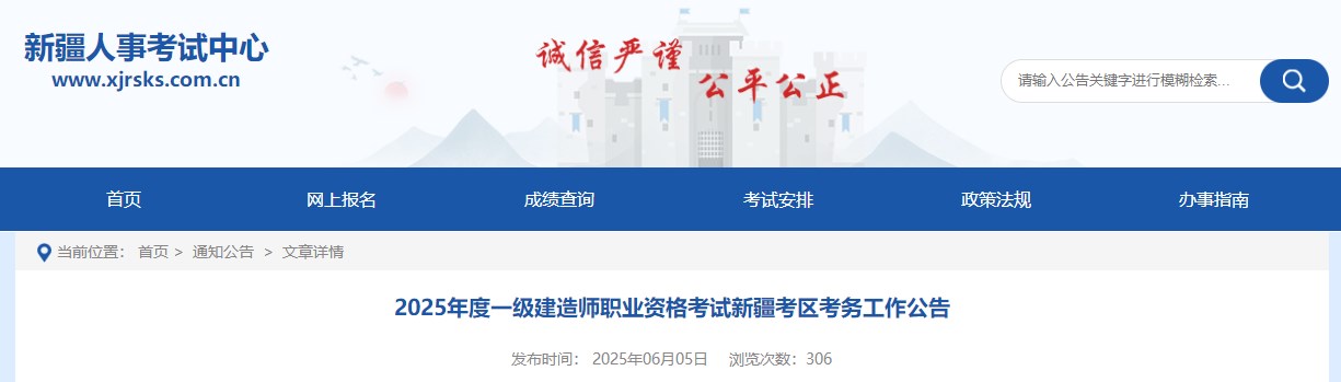 新疆人事考試網(wǎng)發(fā)布2025年度一級(jí)建造師職業(yè)資格考試新疆考區(qū)考務(wù)工作公告,具體信息如下: