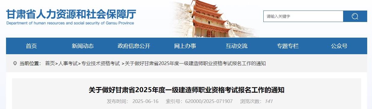 甘肅省人力資源和社會(huì)保障廳發(fā)布關(guān)于做好甘肅省2025年度一級建造師職業(yè)資格考試報(bào)名工作的通知,具體信息如下: