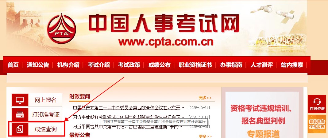 2025年一級(jí)建造師成績查詢?nèi)肟冢?/strong>中國人事考試網(wǎng)-點(diǎn)擊左側(cè)“成績查詢”按鈕,輸入用戶名、密碼、驗(yàn)證碼登錄即可查詢一級(jí)建造師考試成績。