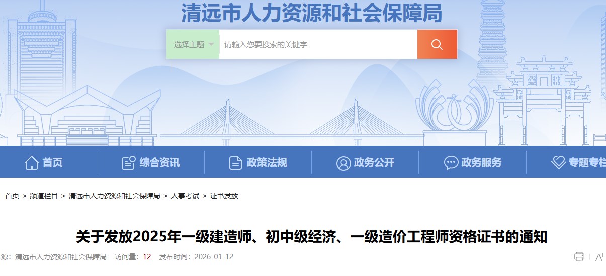 清遠(yuǎn)市人力資源和社會保障局發(fā)布關(guān)于發(fā)放2025年一級建造師、初中級經(jīng)濟、一級造價工程師資格證書的通知,具體信息如下: