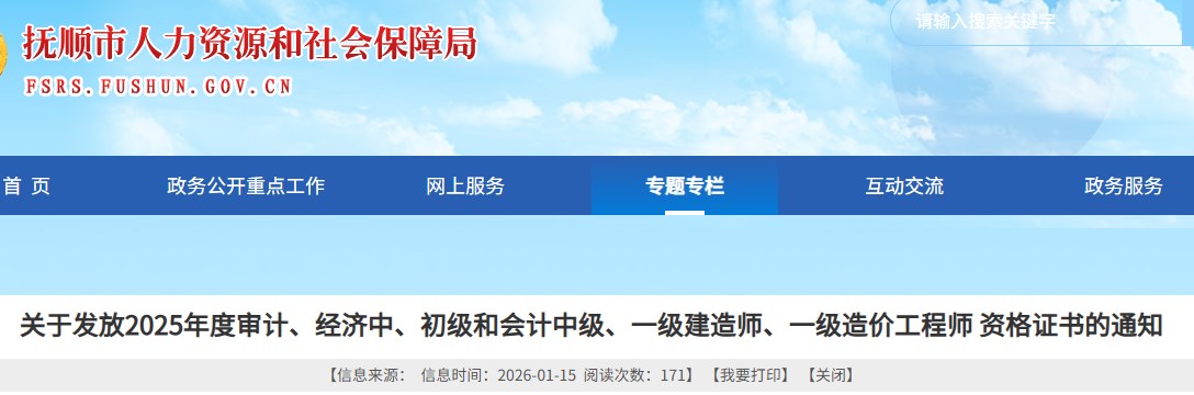 撫順市發(fā)布關(guān)于發(fā)放2025年度一級建造師資格證書的通知