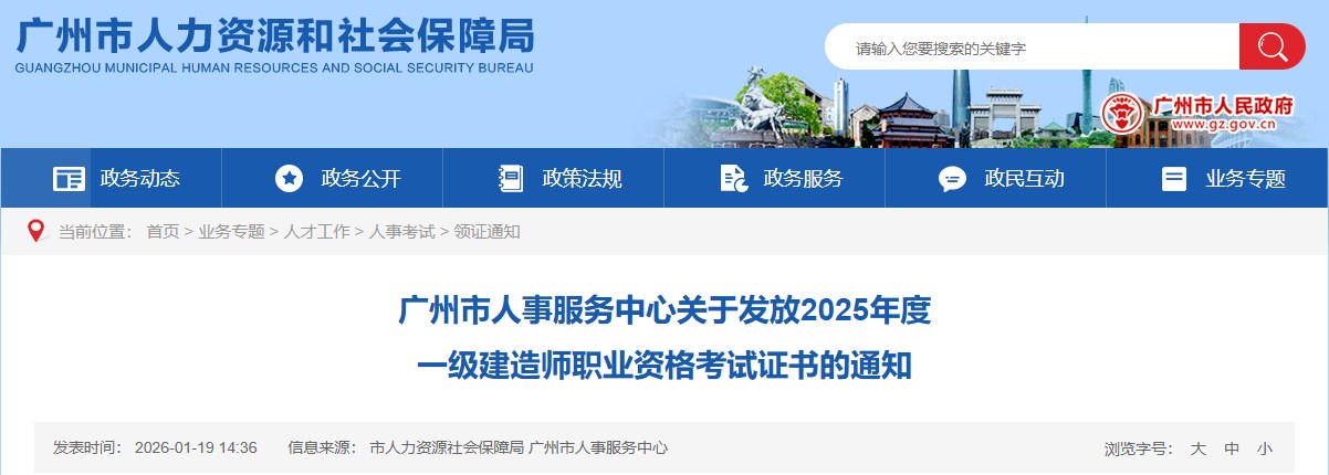 廣州市人力資源社會(huì)保障局發(fā)布廣州市人事服務(wù)中心關(guān)于發(fā)放2025年度一級(jí)建造師職業(yè)資格考試證書的通知,具體信息如下: