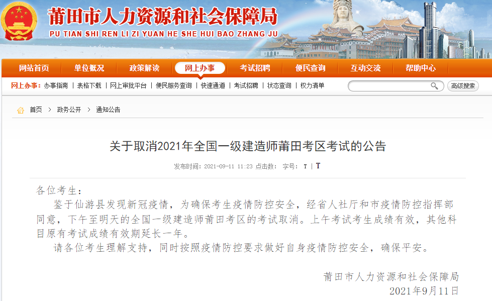 福建莆田市人力社會(huì)局發(fā)布關(guān)于取消2021年一級(jí)建造師考試公告