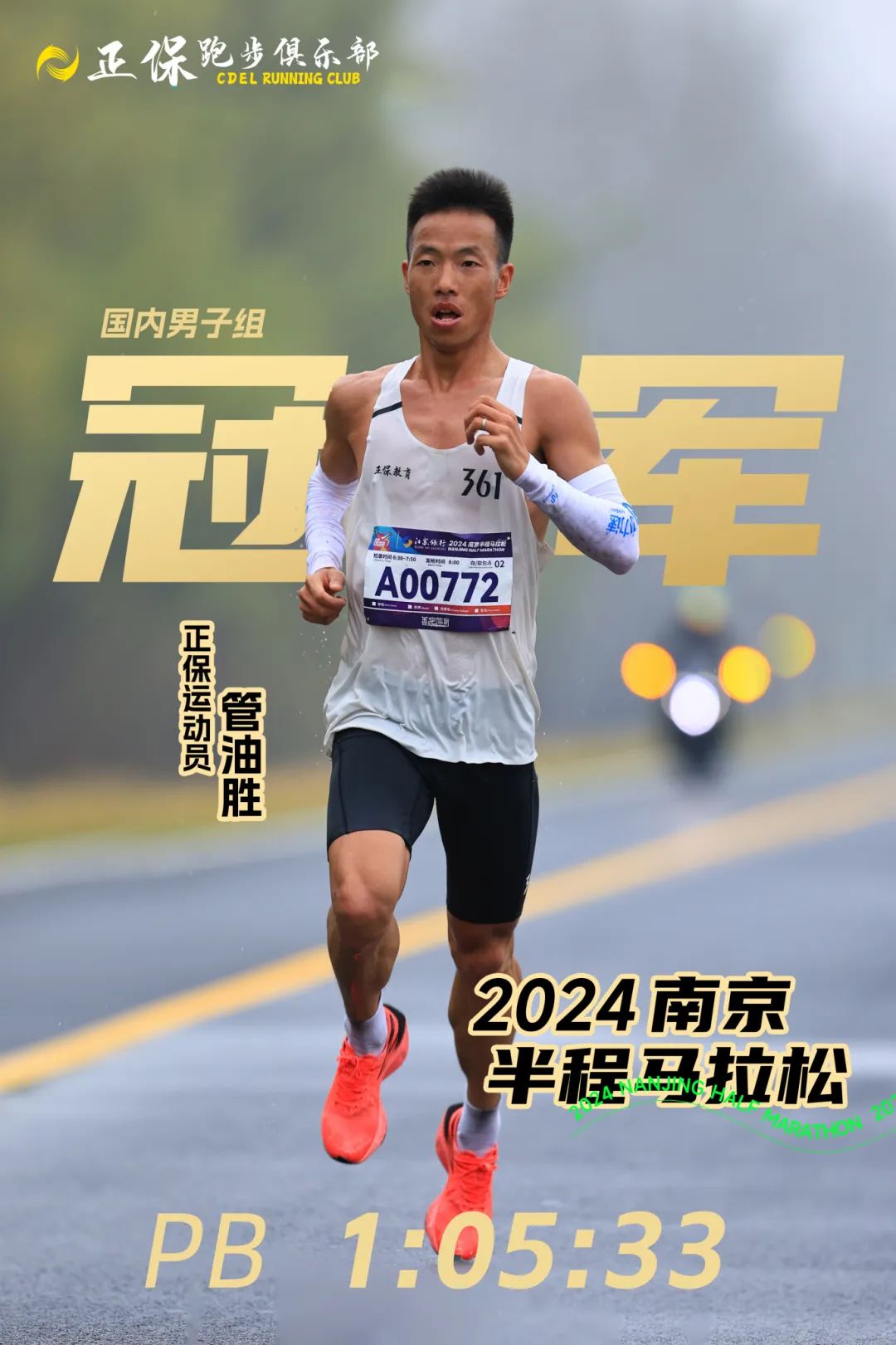昨日(3月17日),2024南京半程馬拉松開跑,正保運動員管油勝以1:05:33獲得男子組國內(nèi)冠軍,國際第四的好成績同時打破個人PB,這也是他本月的第三個冠軍,恭喜他!