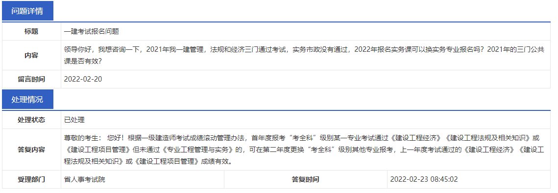 在一建考試中,如果第一年考過了《建設(shè)工程經(jīng)濟(jì)》、《建設(shè)工程項(xiàng)目管理》和《建設(shè)工程法規(guī)及相關(guān)知識(shí) 》只有《專業(yè)工程管理與實(shí)務(wù)》沒通過,第二年想換其他專業(yè)報(bào)考,3門公共科的成績(jī)還有效嗎?官方回復(fù)來了!