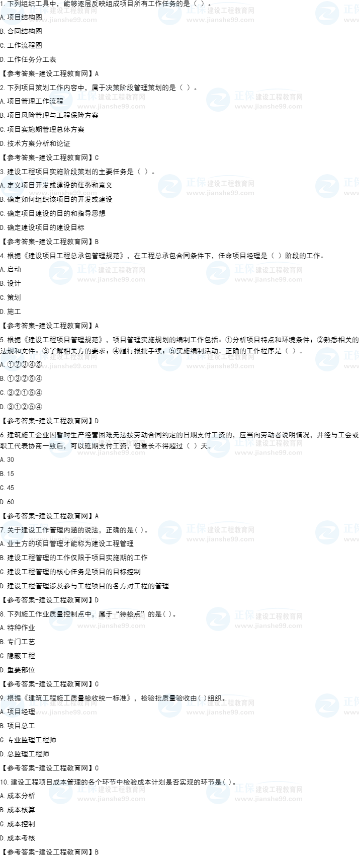 2022年一級(jí)建造師補(bǔ)考項(xiàng)目管理試題及答案1-10題。建設(shè)工程教育網(wǎng)考后將會(huì)根據(jù)學(xué)員反饋,及時(shí)匯總2022年一級(jí)建造師補(bǔ)考項(xiàng)目管理試題及答案分享給大家,并且會(huì)及時(shí)做出答案解析,希望能為廣大一建考生朋友帶來(lái)幫助。