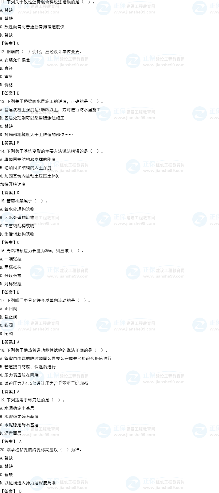 2022年一級建造師補考市政工程試題及答案解析11-20題。建設(shè)工程教育網(wǎng)考后將會根據(jù)學(xué)員反饋,及時匯總2022年一級建造師補考市政工程試題及答案解析分享給大家,并且會及時做出一級建造師答案解析,希望能為廣大一建考生朋友帶來幫助。
