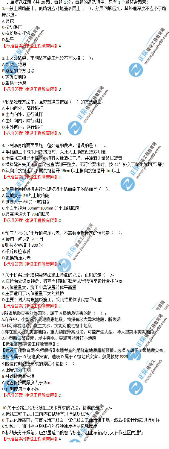2018年一級(jí)建造師《公路實(shí)務(wù)》試題答案及解析(1-10),由考生回憶題干,建設(shè)工程教育網(wǎng)一級(jí)建造師考試教研組團(tuán)提供參考答案,供廣大考生進(jìn)行參考!點(diǎn)擊查看2019年一級(jí)建造師招生方案>>