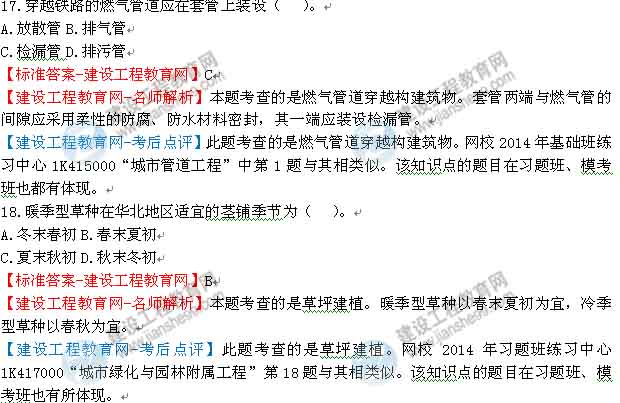 【建設工程教育網(wǎng)-考后點評】此題考查的是大樹移植。網(wǎng)校2014年模考班模擬試題一中第17題,模擬試題三中第4題,習題班練習中心1K417000“城市綠化與園林附屬工程”第12題均與其相類似。該知識點的題目在基礎班、沖刺班也有體現(xiàn)。