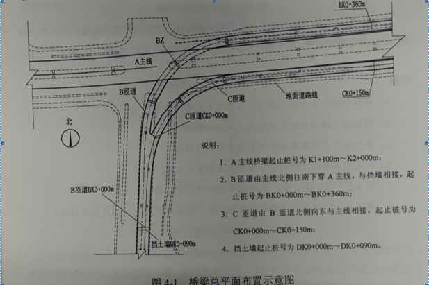某市政工程公司承建城市主干道改造工程標(biāo)段,合同金額為9800萬元,工程主要內(nèi)容為:主線高架橋梁、匝道橋梁、擋土墻及引道,如圖4-1所示。橋梁基礎(chǔ)采用鉆孔灌注樁:上部結(jié)構(gòu)為預(yù)應(yīng)力混凝土連續(xù)箱梁,采用滿堂支架法現(xiàn)澆施工。邊防撞護欄為鋼筋混凝土結(jié)構(gòu)。
