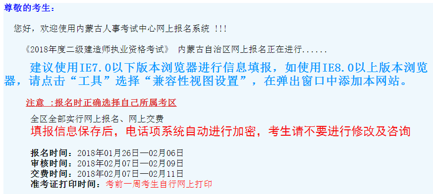 考務(wù)文件:內(nèi)蒙古2018年度二級建造師執(zhí)業(yè)資格考試報名的通知