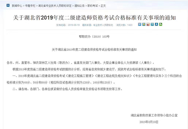 湖北2019年二級(jí)建造師考試成績(jī)合格標(biāo)準(zhǔn)公布