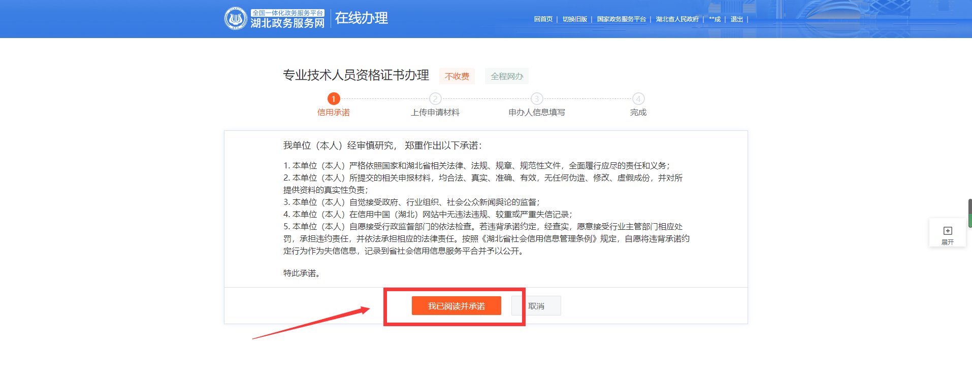 4.請(qǐng)認(rèn)真閱讀專(zhuān)業(yè)技術(shù)人員資格證書(shū)辦理承諾書(shū),確認(rèn)無(wú)異議后點(diǎn)擊“我已閱讀并承諾”。