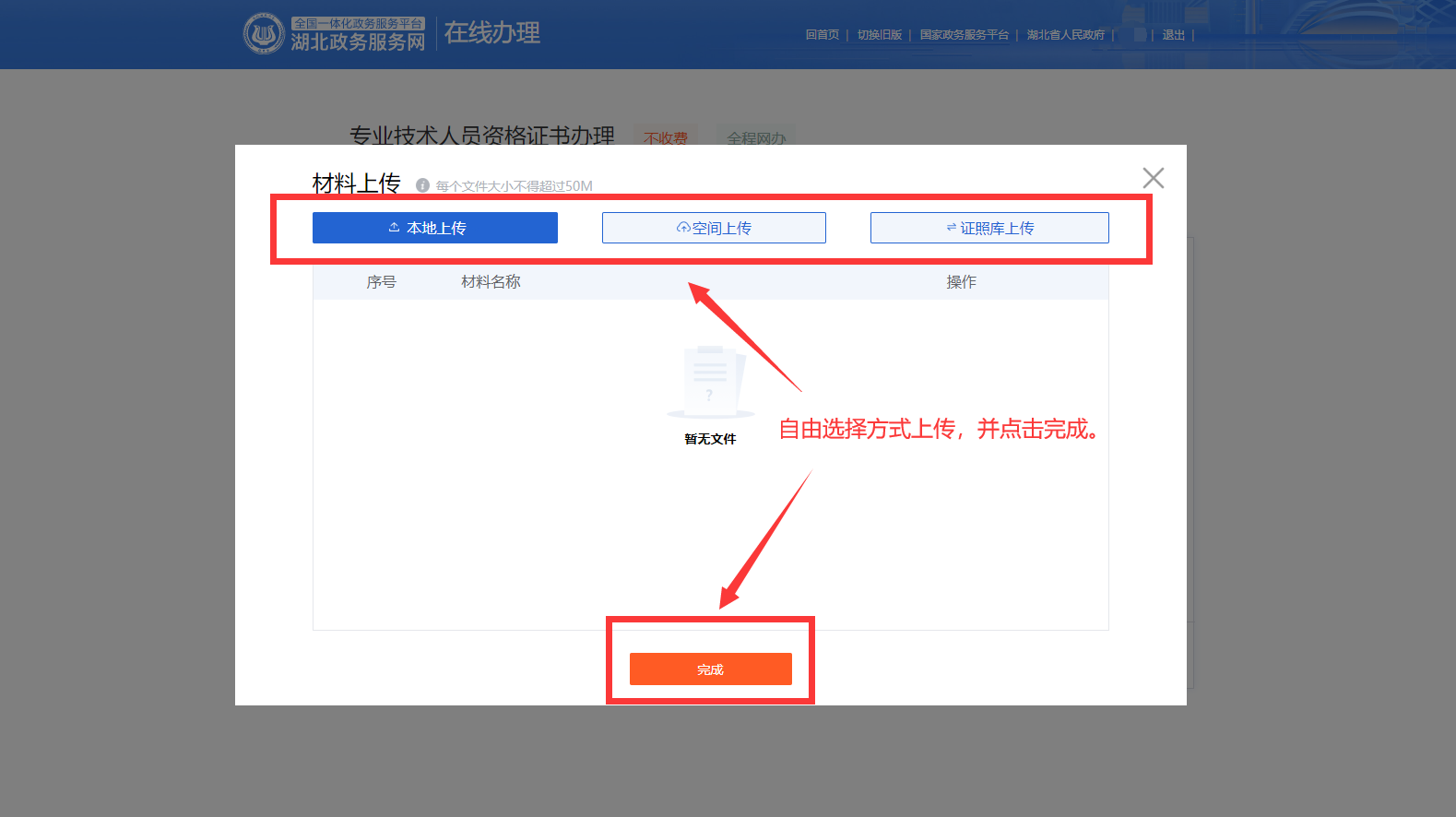 6.根據(jù)個(gè)人需要,選擇上傳方式上傳“考生證書(shū)領(lǐng)取申請(qǐng)表”,并點(diǎn)擊完成。