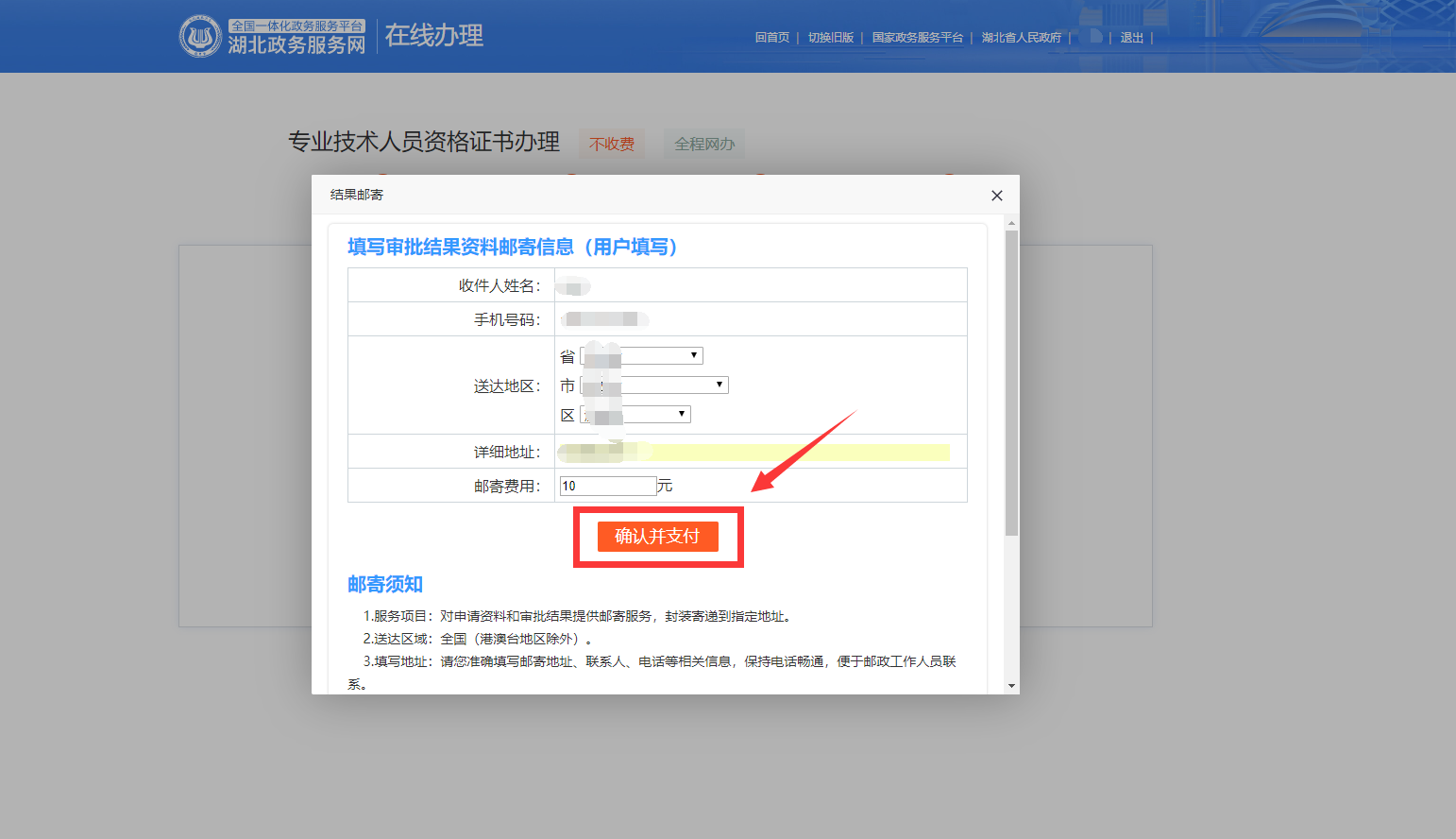 9.選擇送達(dá)地區(qū)所在省市區(qū),并填寫(xiě)詳細(xì)地址(如道路、門(mén)牌號(hào)、小區(qū)、樓棟號(hào)、單元室等),系統(tǒng)會(huì)自動(dòng)計(jì)算出郵寄費(fèi)用,具體收費(fèi)標(biāo)準(zhǔn)見(jiàn)界面下方“郵寄須知”;請(qǐng)?jiān)诖_認(rèn)地址無(wú)誤,并對(duì)郵寄費(fèi)用數(shù)額無(wú)異議后,點(diǎn)擊“確認(rèn)并支付”。