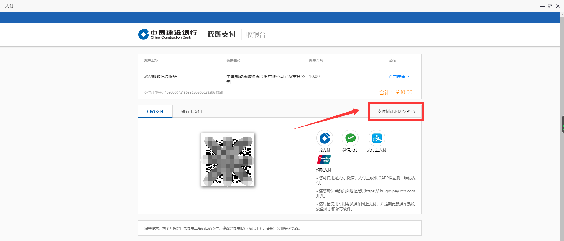 10.出現(xiàn)付款二維碼后,請(qǐng)?jiān)谥Ц兜褂?jì)時(shí)結(jié)束前使用微信、支付寶或龍支付掃碼支付證書(shū)郵寄費(fèi)用。