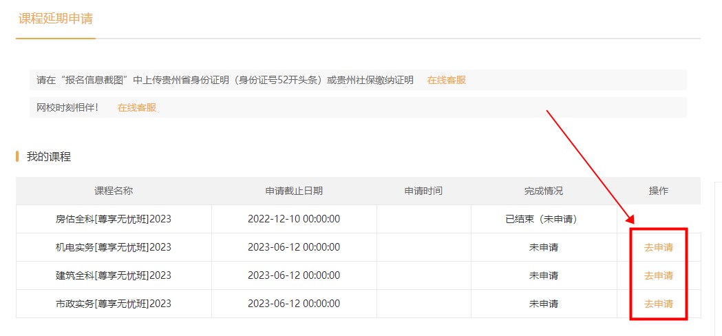 網(wǎng)校2023年二級(jí)建造師課程將于6月11日關(guān)閉,貴州考生可在我的網(wǎng)校我的家申請(qǐng)課程延期,我們將為貴州考生將課程延期至貴州考后一周。課程延期申請(qǐng)入口將于6月10日0點(diǎn)關(guān)閉,逾期無法申請(qǐng)。