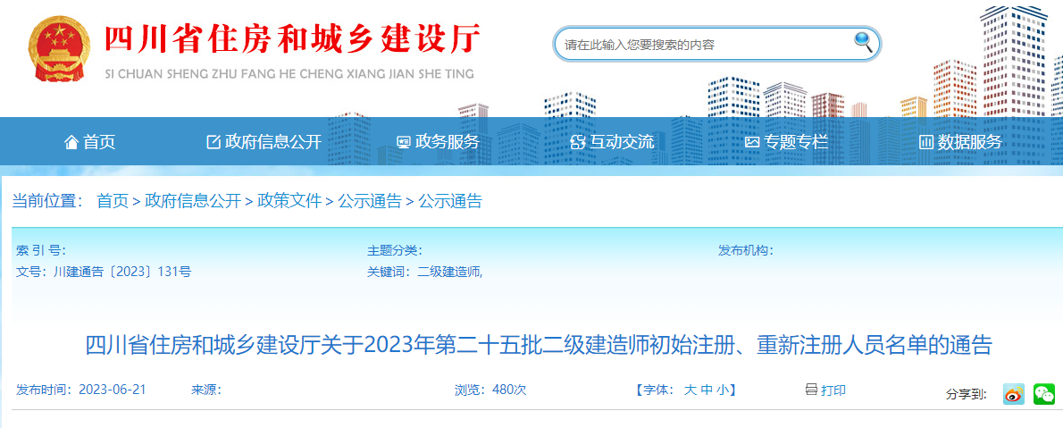 四川省住房和城鄉(xiāng)建設廳關于2023年第二十五批二級建造師初始注冊、重新注冊人員名單的通告
