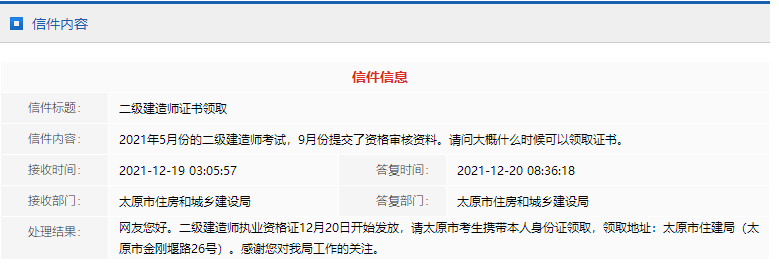 太原市公布二級建造師證書領(lǐng)取時間及其地點(diǎn)