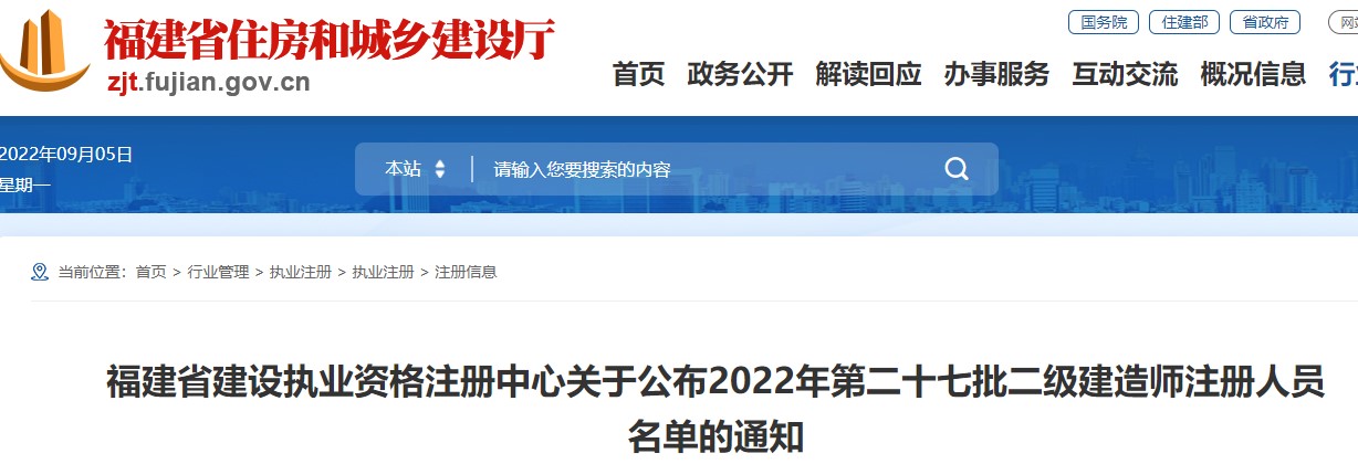 福建省關(guān)于公布2022年第二十七批二級(jí)建造師注冊(cè)人員名單的通知